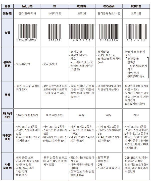 바코드를 제작하기 위해서는 기본적으로 어떤 용도로 바코드를 사용할지 어떤 종류의 데이터를 인코딩할 지에 따라 바코드의 종류가 달라집니다. 참고로 요약된 정보를 아래와 같이 첨부합니다.