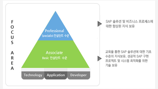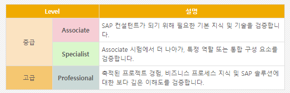 우선 SAP 인증은 위에서 말씀 드린바와 같이 분야별, 즉 SAP 기반 기술, 모듈별 지식, 개발자 등으로 분류해서 자격을 부여하며 배이직 컨설턴트 수준인 어소시에이트(Associate)와 스페셜리스트 컨설턴트 수준인 프로페셔널(Professional)로 나뉩니다.