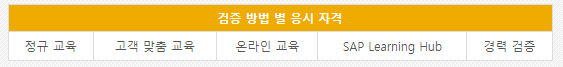 SAP의 교육 프로그램은 아래의 표와 같이 네 가지 종류로 분류됩니다. 정규교육, 고객 맞춤교육, 온라인 교육, SAP Learning Hub를 통한 교육으로 나뉩니다. 정규교육, 고객 맞춤교육, 온라인 교육은 교육종료일 이후 시험신청이 가능하며 교육 수료율이 80% 이 되어야 합니다.